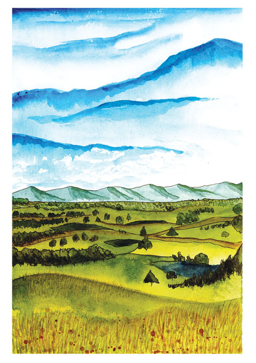 A5 Tasmanian Farm Hills Watercolour Painting Print